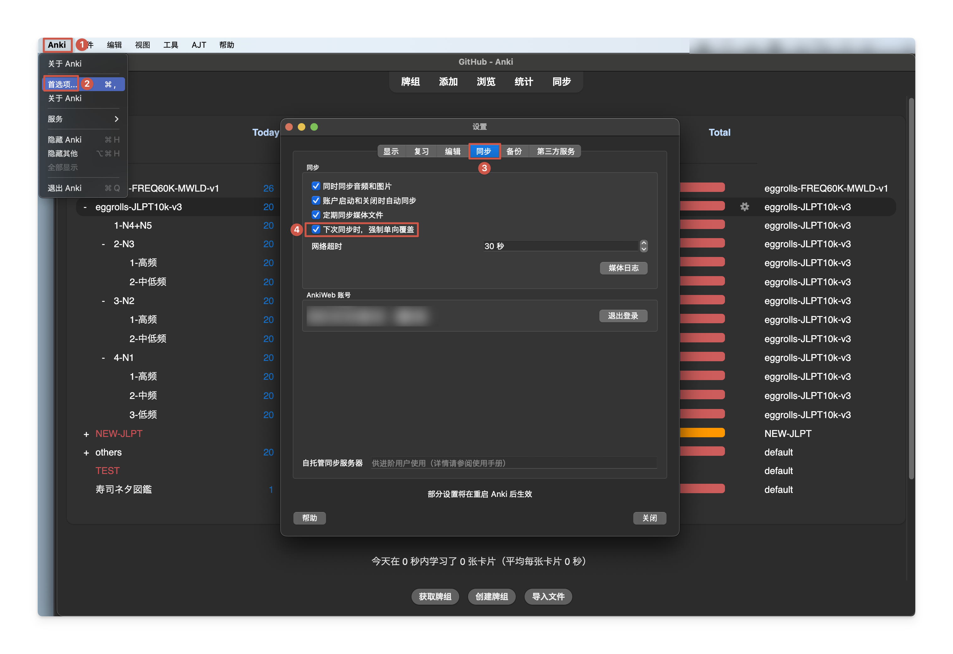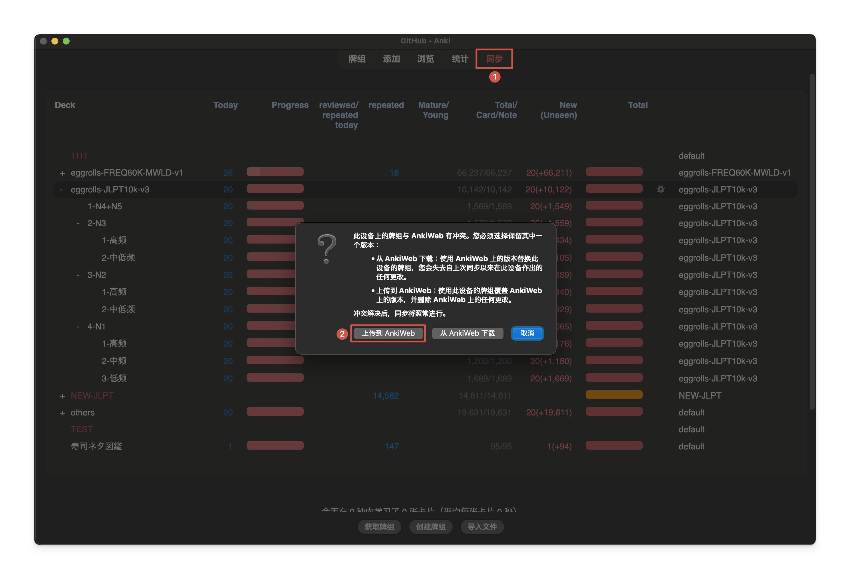 同步时,请保持 Anki 处于前台并保持屏幕常亮(移动端);如有需要,可使用网络代理(翻墙)工具来提升同步速度。