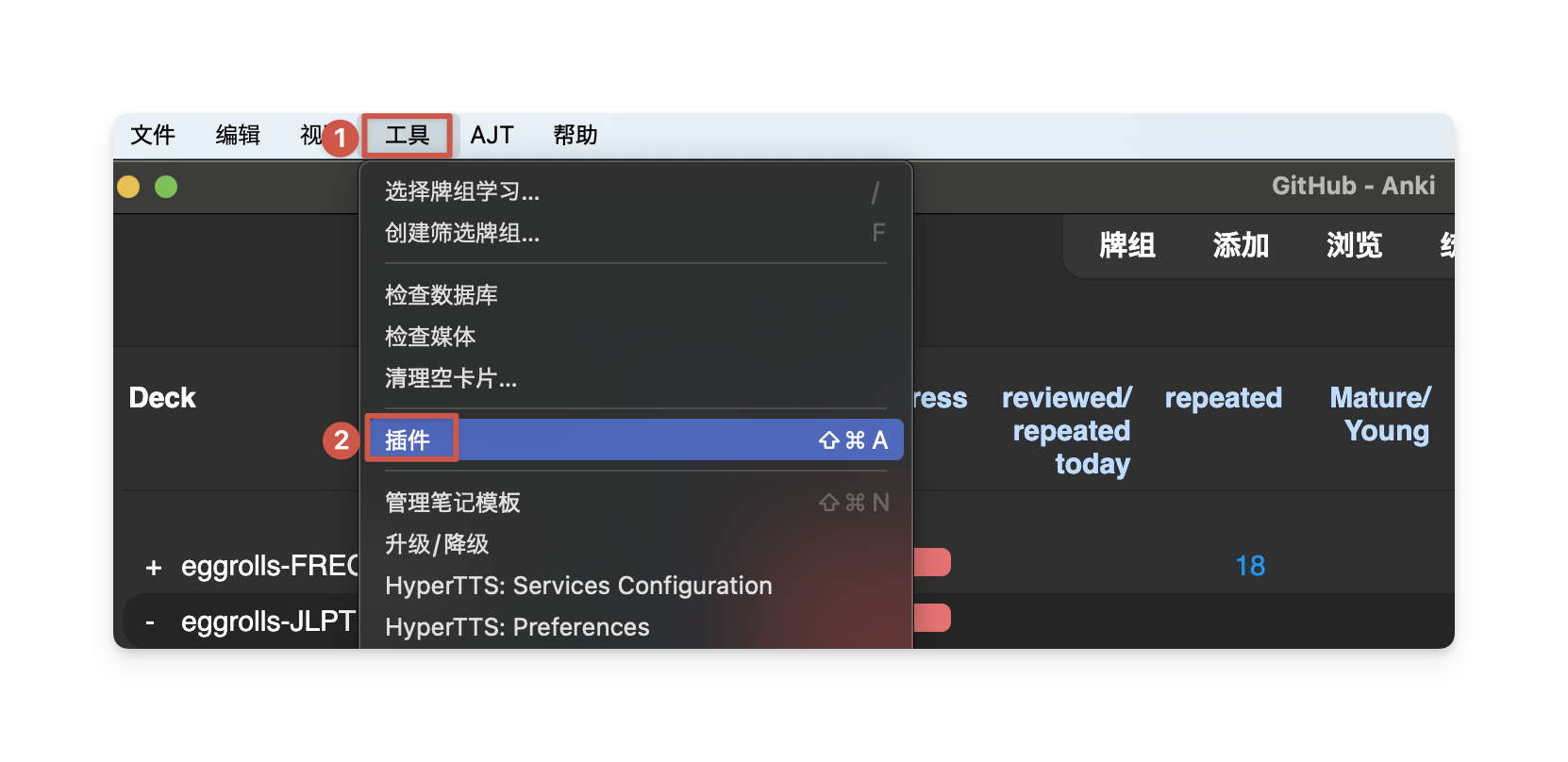 打开(如下图绿框所示),以应用本卡组提供的优化预设(名为「eggrolls-JLPT10k-v3」)。⚠️ 受限于 Anki 本身的机制,部分预设无法自动导入,请参阅后续的「修改牌组选项」手动调整。