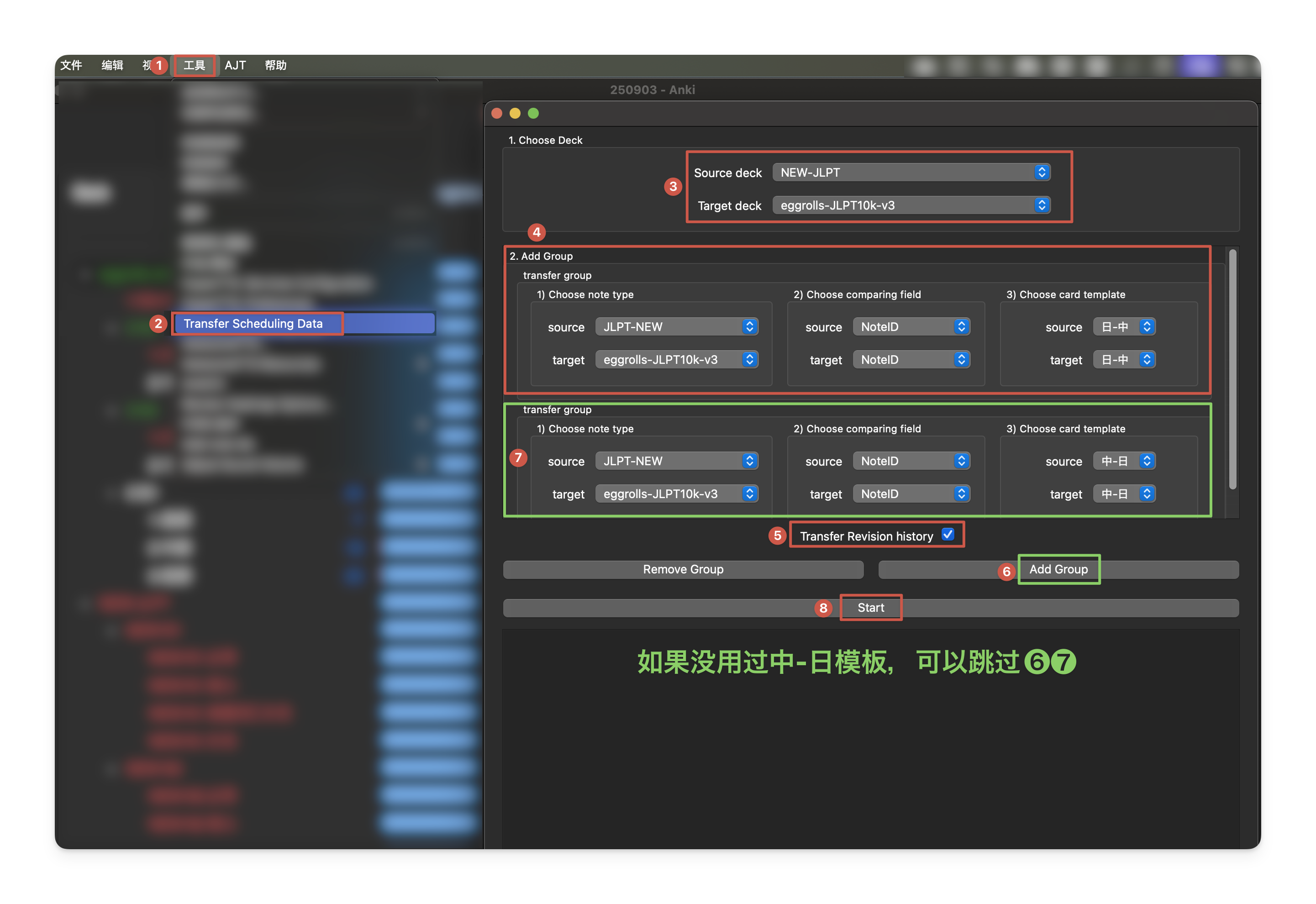 如果开启了中-日模板,那么一定要先把新卡组的中-日模板也打开(确保“浏览”页面中出现新卡组的中-日卡片),再迁移学习记录!