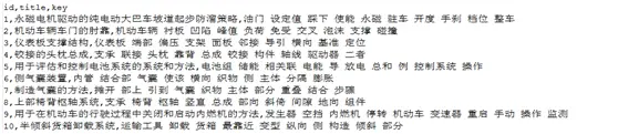 文本将汽车行业的10篇专利作为样本数据集,见文件“data/sample_data.csv”。文件中依顺序包含编号(id)、标题(title)和摘要(abstract)三个字段,其中标题和摘要都要参与到关键词的抽取。各位可根据自己的样本数据进行数据读取相关代码的调整。