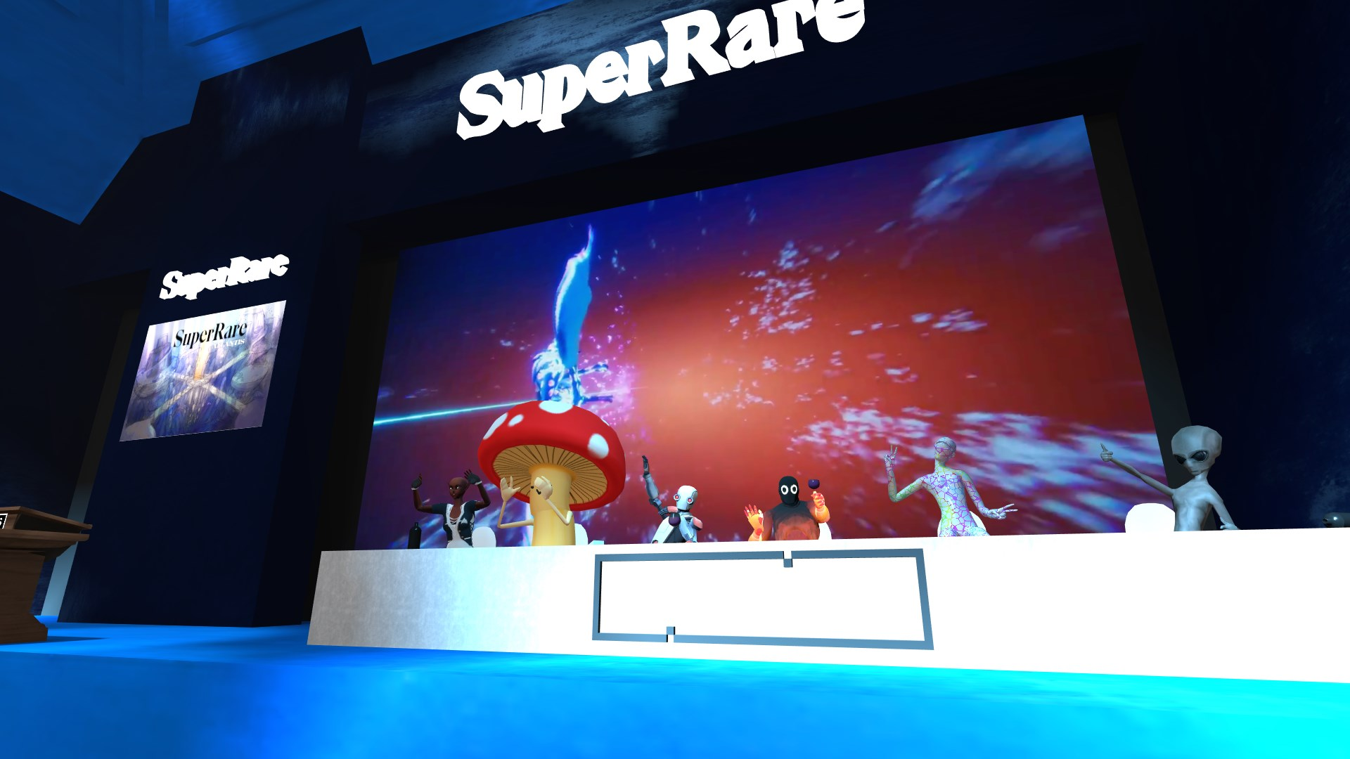 Artists are most definitely metaverse makers. Superrare held an art show in VRChat called Atlantis where giant 3D tokenized pieces were on display in an immersive underwater world. There was a side event connected to the main gallery which took you to a big gallery space with wine and cheese. Further down the hall, the space opened up to a virtual production studio set modeled after Christies auction house for a panel discussion about cryptoart and VR.