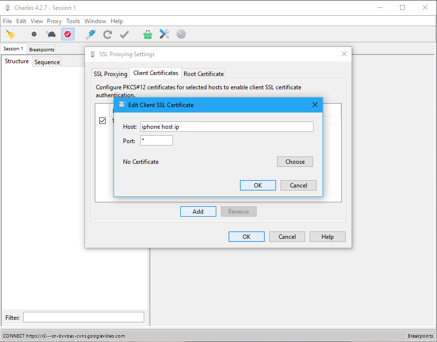 Now we need to start the intercepter in Charles Proxy in order to download the SSL Certificate. In order to do this press the little Recorder button on Charles Proxy shown here: