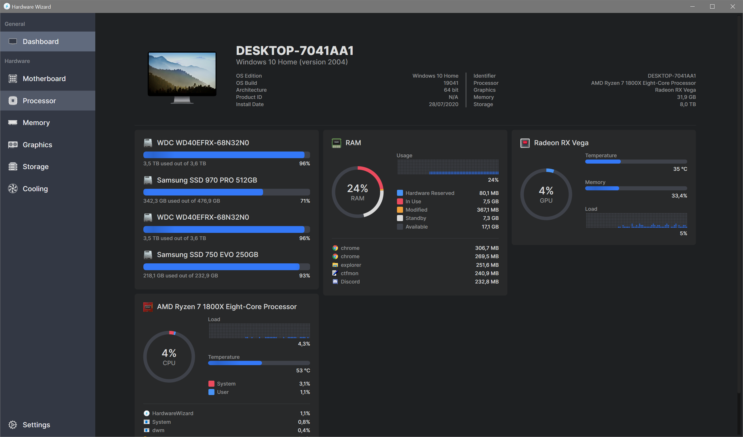 - Graphic Cards: load, temperature, fans speed, memory usage, specifications.