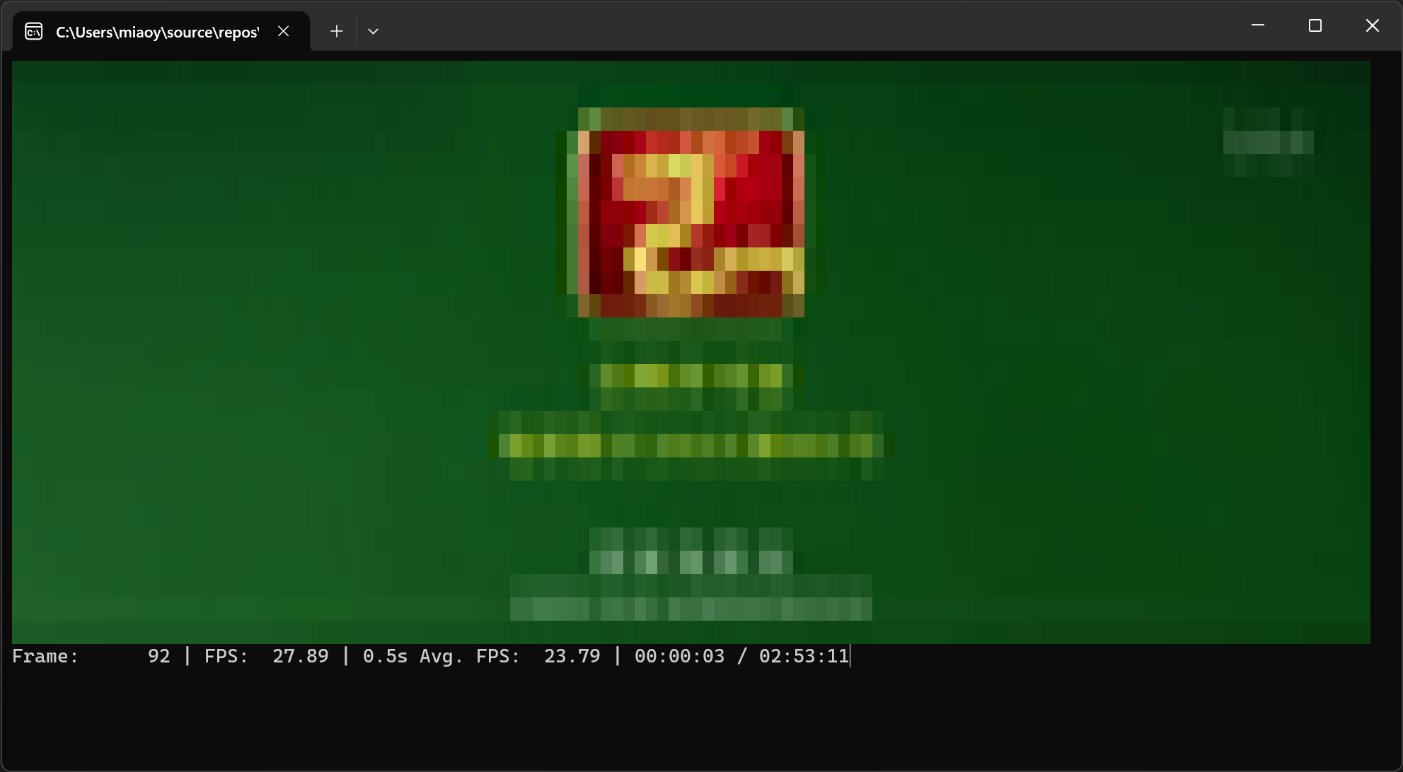 ConsoleVideoPlayerVT100 Play video in console by using FFmpeg to decode and VT100/ANSI escape codes to display. 在控制台播放视频,使用 FFmpeg 解码,使用 VT100/ANSI 转义符显示。 Preview 预览