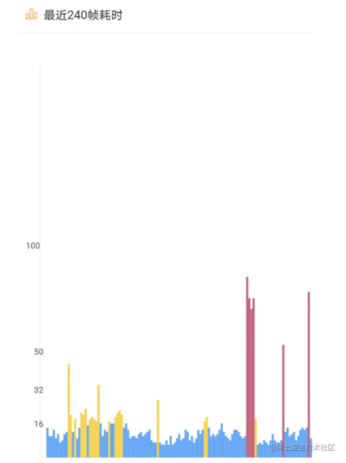 首先一句话告诉你:这是一个能在 profile/debug 模式下,直观帮助我们评估页面流畅度的工具!! 直白来说就是:这是一个可以在(刷新率60)设备上直接查看最近(默认 100)帧的表现情况的小工具,直接上图: