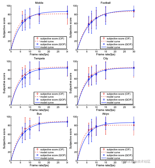 有没有客观一点的指标,我在网上查询了很久之后找到了一篇08年发表在ICIP上的论文Modeling the impact of frame rate on perceptual quality of video 他们使用了6种内容进行测试,实验结果如下图所示