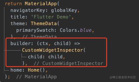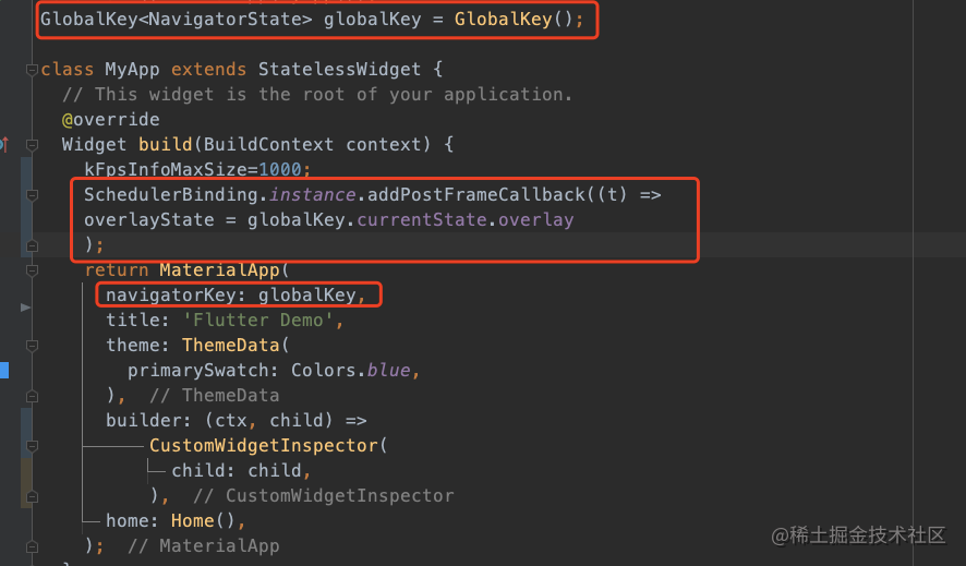 - 指定overLayState ,因为需要弹出一个Fps的统计页面,所以当前指定overLayState。 (PS:大家一般使用Navigator.of(context)去跳转一个页面,通过GlobalKey可以实现无context的跳转)