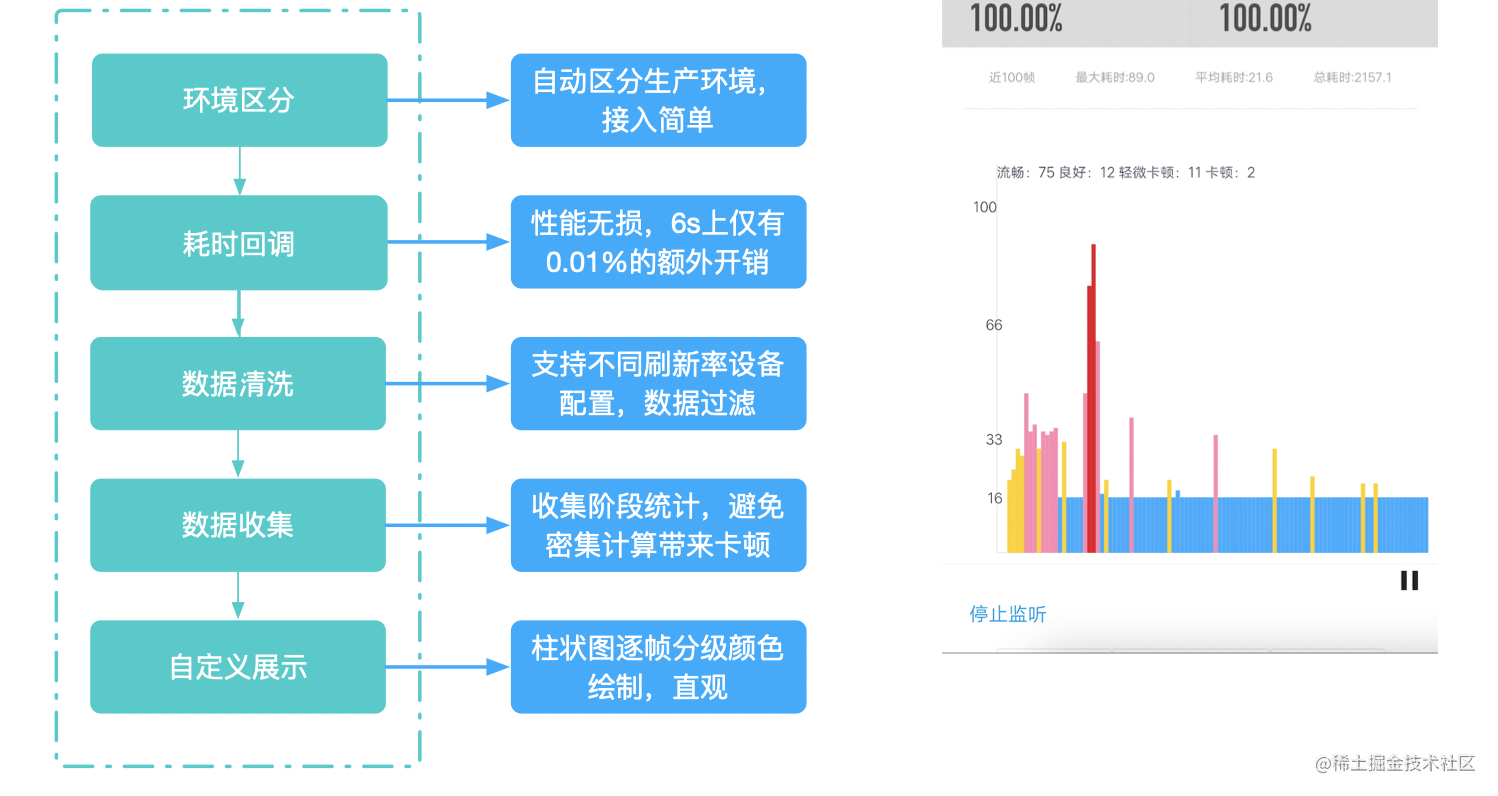 但DoKit同样没有对最小帧耗时做过滤,也会出现平均耗时偏低的情况。同时,没有更多的数据辅助评估页面的流畅程度。
