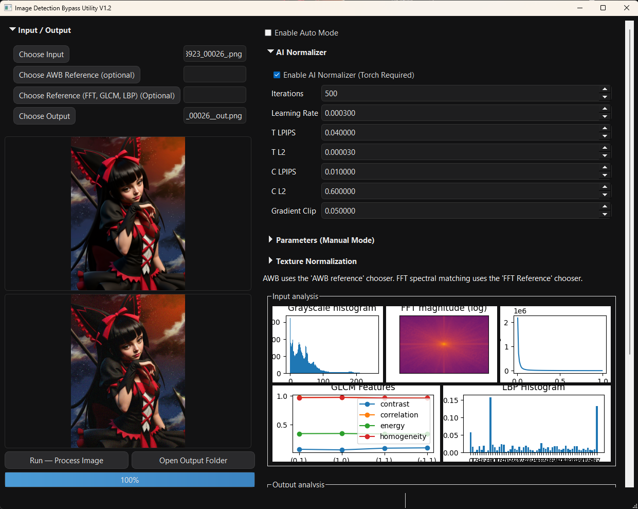pip install -r requirements.txtimage_postprocess— your processing logic (exportprocess_image(...)or compatible API).worker.py— Worker thread wrapper used to run the pipeline in background.analysis_panel.py— UI widget used for input/output analysis.utils.py— must provideqpixmap_from_path(path, max_size=(w,h)).