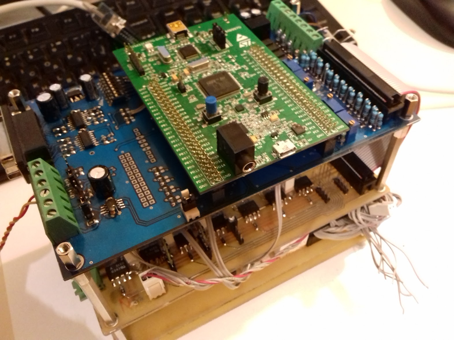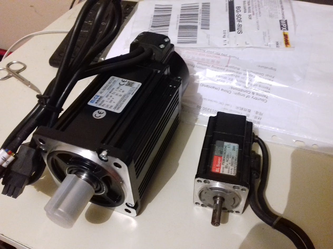 "След аналоговото DC-Servo (viewtopic.php?f=22&t=13129) започнах работа по BLDC-Servo. Работих по хардуерен синусоидален контрол на AC Servo motor (PMSM) с три токови ШИМ-а. Успях да постигна токова регулация в 6 стъпкова комутация. Синусоидален режим така и не подкарах напълно. Но в крайна сметка това беше само за упражнение. Целта през цялото време беше векторно управление (FOC) на мотора. Самия мотор претърпя малка реконструкция - изведох сигналите за комутация UVW навън през RS422 предавател.