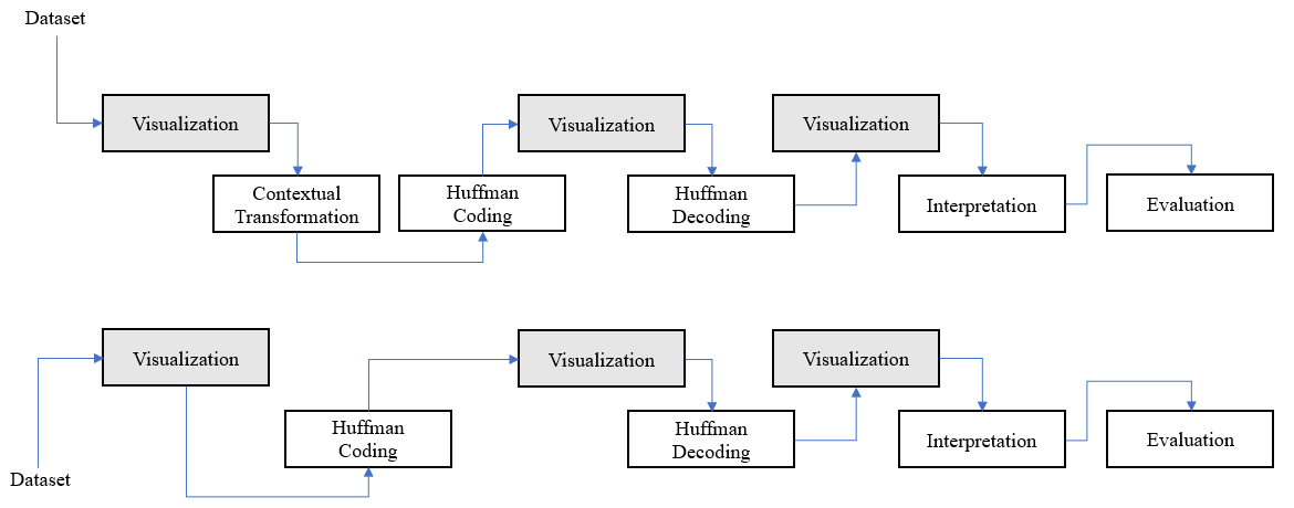 Modern compression tools and techniques are not based solely on the use of a compression algorithm, actually the use of this is part of the final stage of an entire compression pipeline, but before reaching the last one, there is a stage called contextual transformations that are responsible for reorganizing the symbols of the data set so that they are more sensitive to statistical compression methods such as Huffman, in other words they are artificial generators of redundancy, two of the main algorithms that will be explained in this research are the BWT and the MTF.