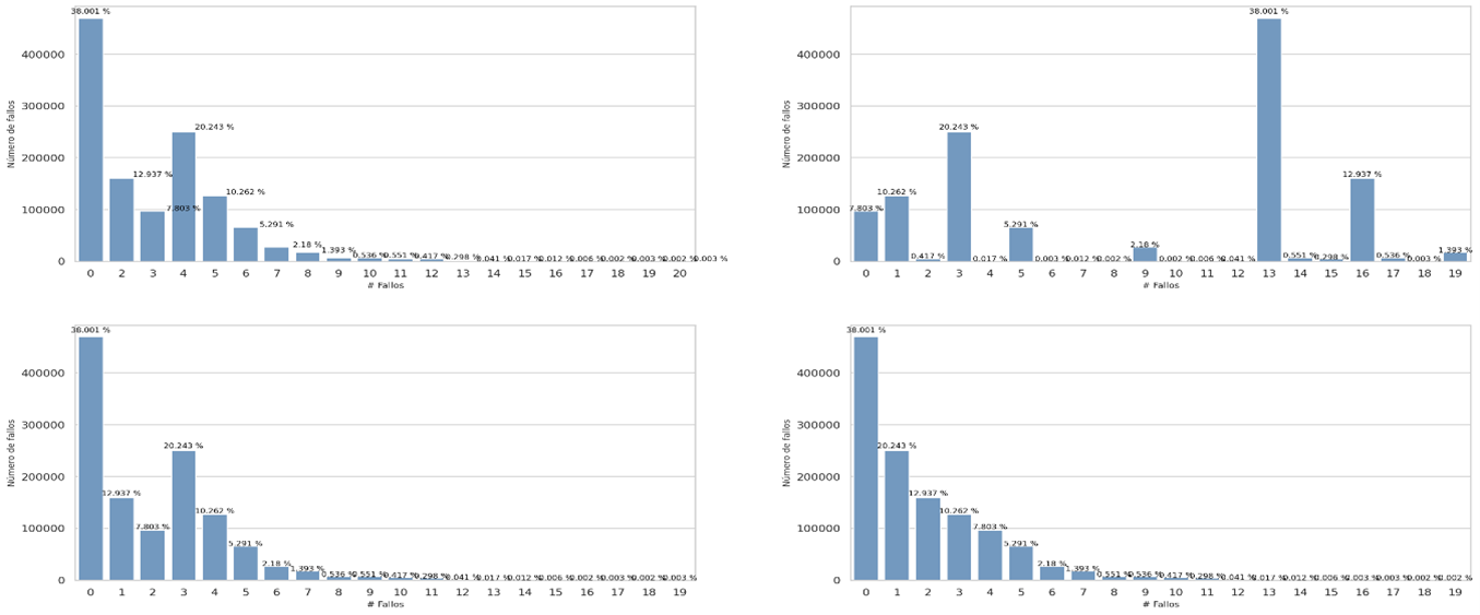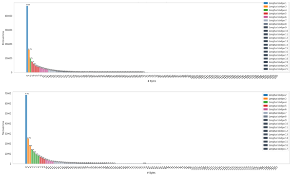 Below, the distribution of the code lengths per symbol for each dataset is shown, there are common features that are independent of the probability distribution of the symbols, we can see that for datasets that have information in natural language, most of the information is concentrated in symbols or bytes of length 3, another relevant feature that is common in uniform and non-uniform distributions is the presence of Benford's law, there are more symbols that begin with the number 1, the objective of this phase is to visualize that Symbol groups contain more information and what length of code is associated with them.