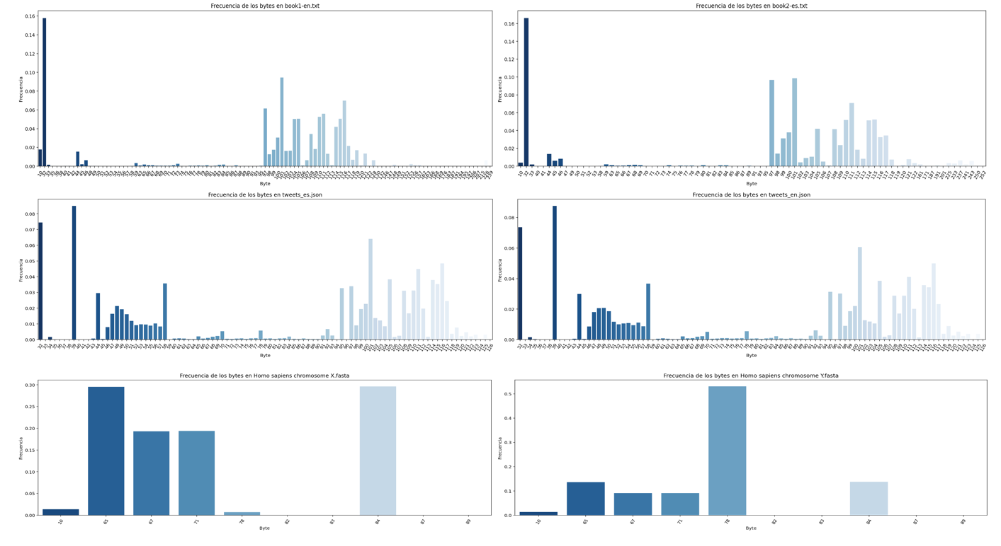 The Graphs with the distribution of symbols of each file are shown below. In most cases and because the content of some files is in natural language, Benford's law can be observed, there is a large amount of information accumulated in bytes that begin with the number 1, it can also be observed that there is a large amount of information accumulated in three-digit bytes, for .fasta files it can be observed the presence of a very short alphabet and special symbols that are related to the structure file standard, the last table in this section shows a numerical summary of the entropy analysis of each file, the necessary bytes and gain columns are related to the following formulas consecutively