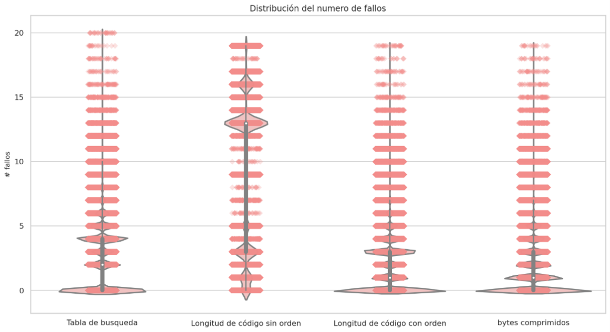 For the previous data set, decoding the 24 symbols of the compressed bitstream pattern has a cost of 35 attempts, although the symbols involved in the second equation are the different symbols that appear in the Huffman table, in this case they are 6 different symbols, the objective of measuring the failure is to find a relationship that leads us to reduce it to try to improve the overall response time of the algorithm.