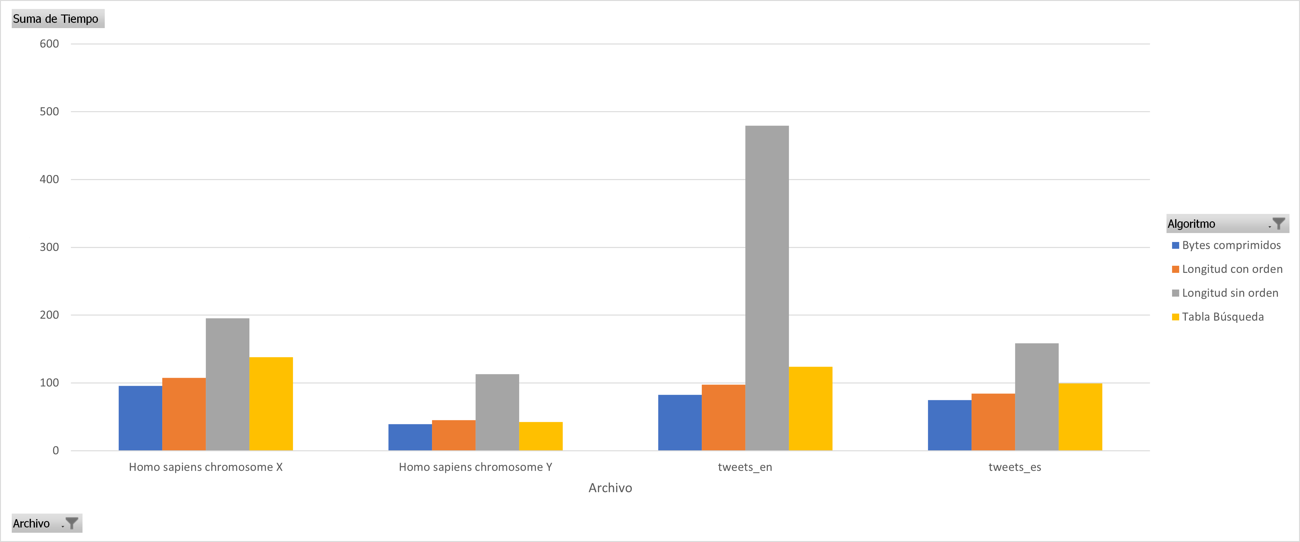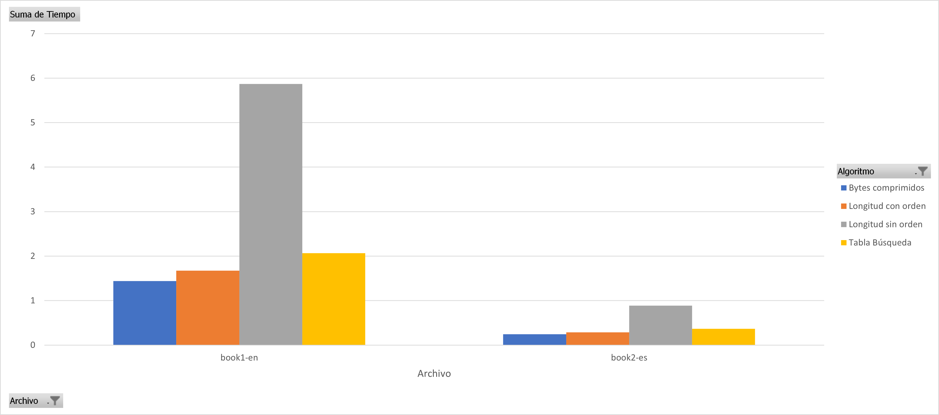 In almost all cases it can be seen that sorting the huffman table by the code lengths containing the most compressed bytes is a better sequential decoding option based on code lengths. The following graphs show the results for each group of files with similar sizes, the decision to separate the graphs into different groups was to keep the Y axis in the same bounds, the decoding technique based on Markov chains was removed since it presents the worst times of decoding in all cases.