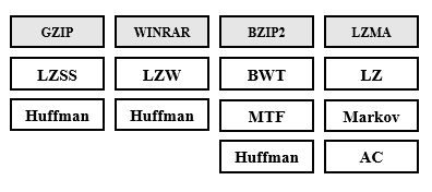 It should be noted that the Huffman algorithm is widely used in many known compression tools or codecs, the image below shows the compression pipelines of some of these tools and we can see that the huffman coding is very common in much of them