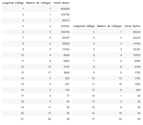 Summary tables of generated code lengths for the SARS-CoV-2.fasta e Información and el universo holográfico.txt data sets from left to right