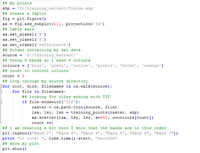 I called this function 'training points' and I passed ‘raster’ (the file name of 1 band) and ‘shp’ (the shapefile containing my 8 points). I then created 3 empty lists: lsx, lsy and lsz where I am going to append the x and y coordinates from the shapefile and the z (the value of the reflectance in the raster). Again this function is adapted from code I found in the above link.