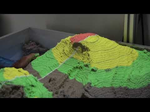 The AR Sandbox is based on a container filled with sand, the surface of which can be shaped as required. The topography of the sand surface is continuously scanned by a 3D sensor and a camera. In the computer the scanned surface is now blended with a digital geological 3D model (or other data) in real time and an image is calculated, which is projected onto the sand surface by means of a beamer. This results in an interactive model with which the user can interact in an intuitive way and which visualizes and comprehend complex three-dimensional facts in an accessible way.