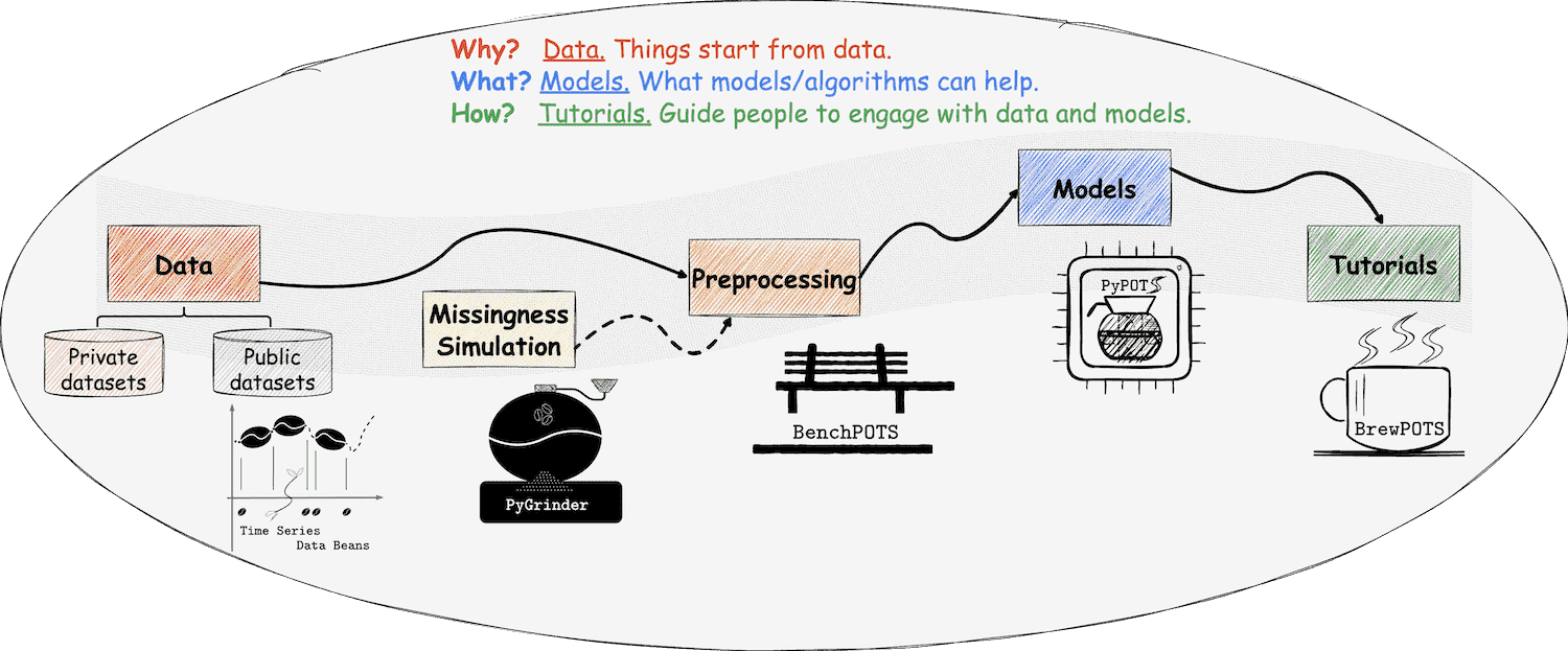 👉 Now the beans, grinder, and pot are ready, please have a seat on the bench and let's think about how to brew us a cup of coffee. Tutorials are necessary! Considering the future workload, PyPOTS tutorials are released in a single repo, and you can find them in BrewPOTS. Take a look at it now, and learn how to brew your POTS datasets!