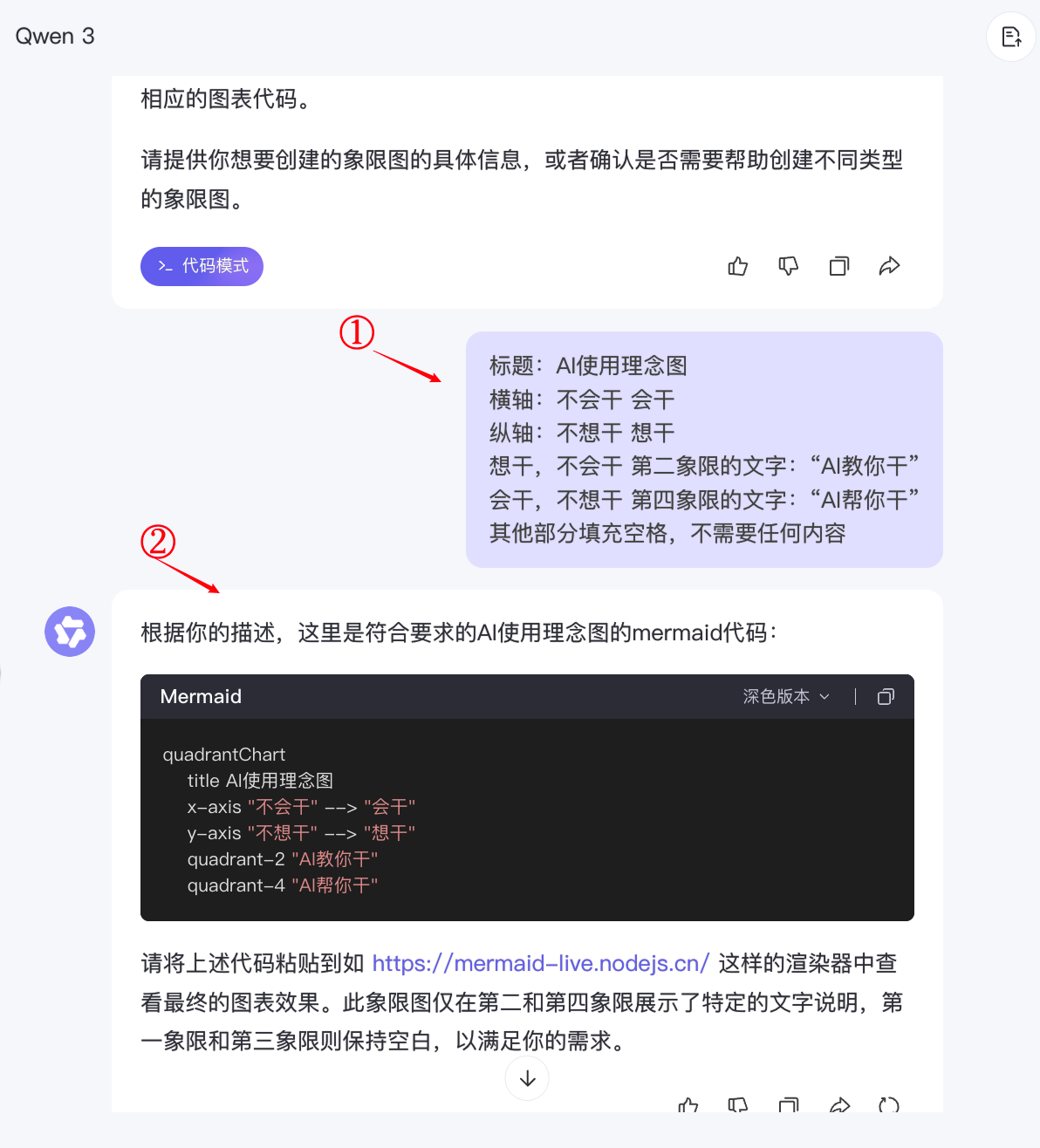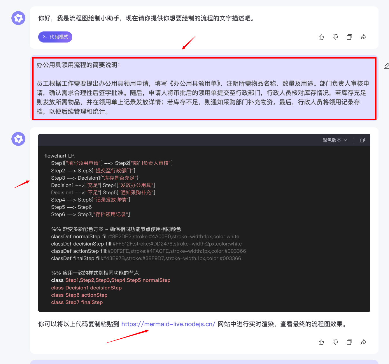 只需要:发送提示词 -> 描述流程 -> 千问3自动写mermaid 代码 -> 渲染得到流程图