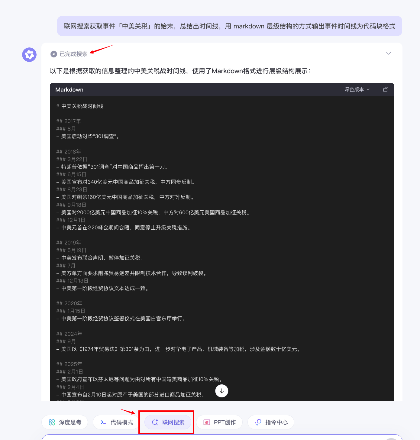 开启「联网搜索」功能,输入下面的提示词即可实现对「中美关税」事件始末的梳理。
