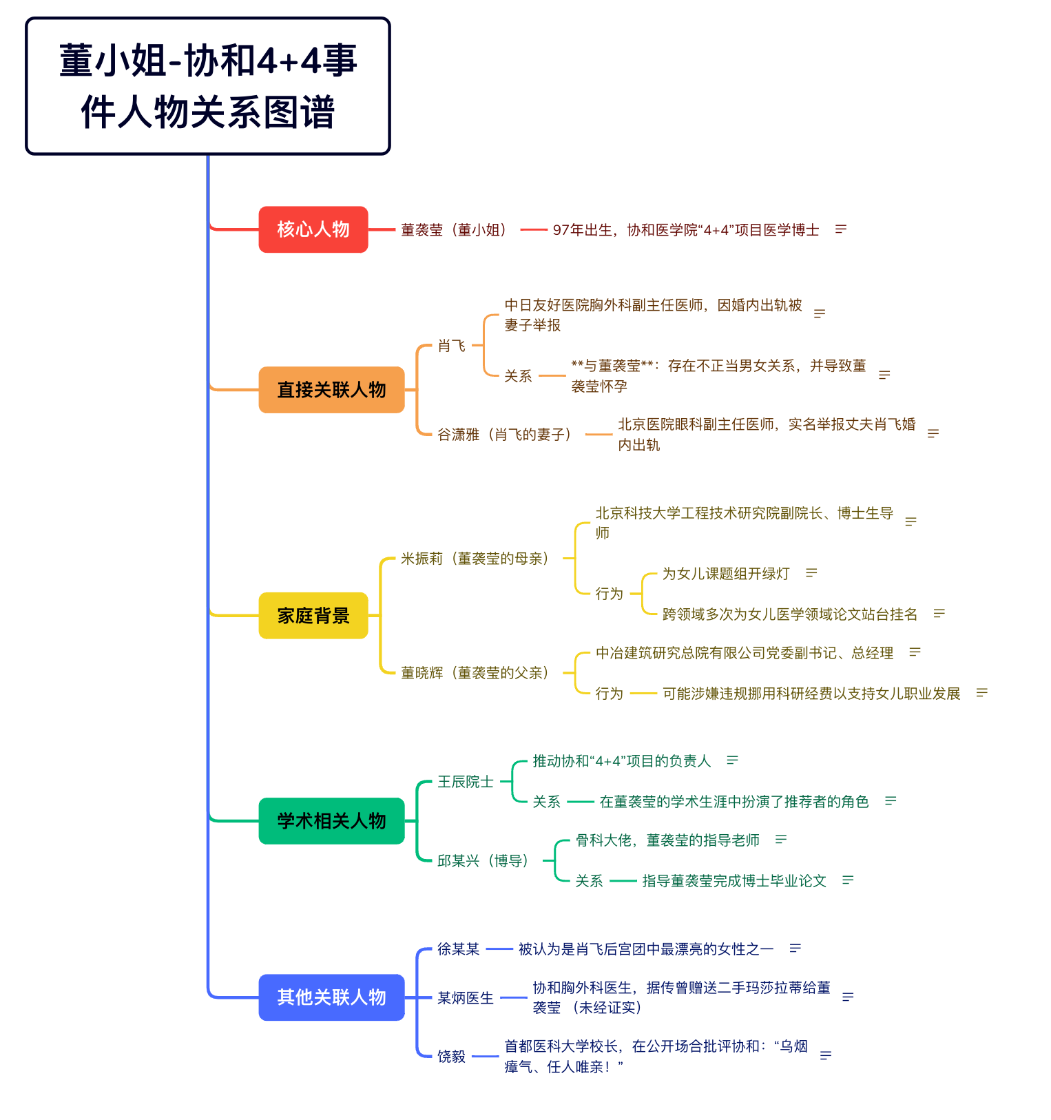 联网搜索获取「董小姐-协和4+4事件」的始末,总结出人物关系,用 markdown 层级结构的方式输出人物关系图谱为代码块格式。
