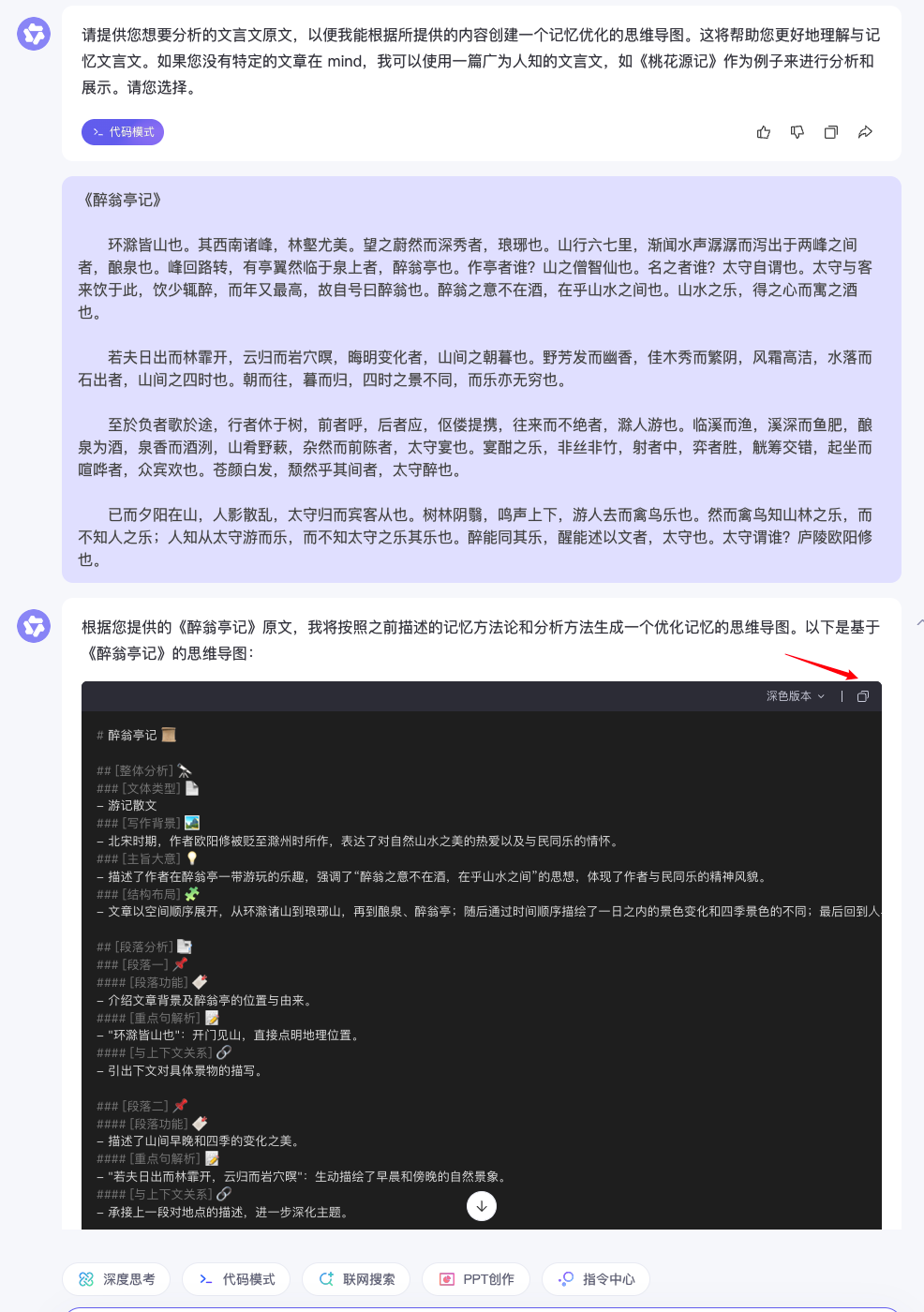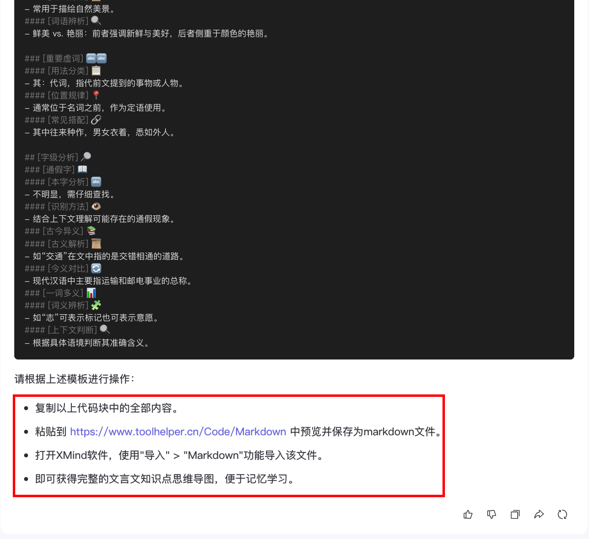 但是这时候的内容还不是可视化的思维导图,提示词中设定了会提醒如何转为思维导图。
