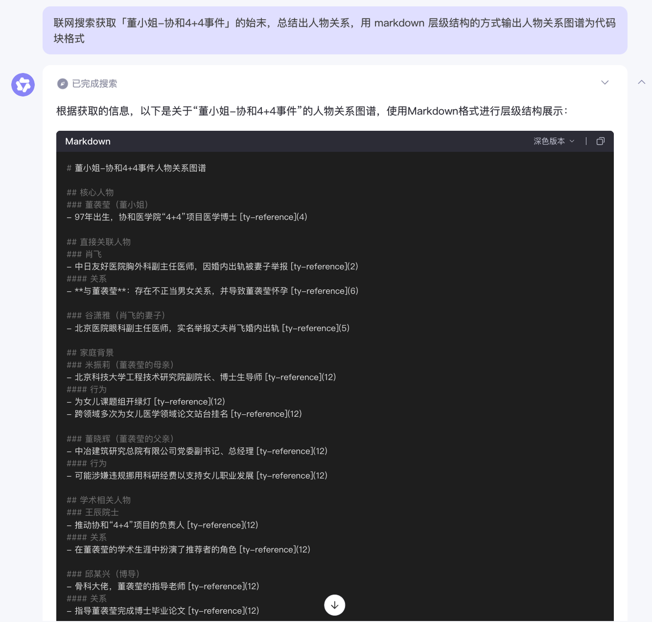 同样的思路,开启联网功能,我们还可以5分钟内将全网热瓜"董小姐-协和4+4事件"吃的明明白白。这个方法对于理解复杂的人物关系网络特别有效。