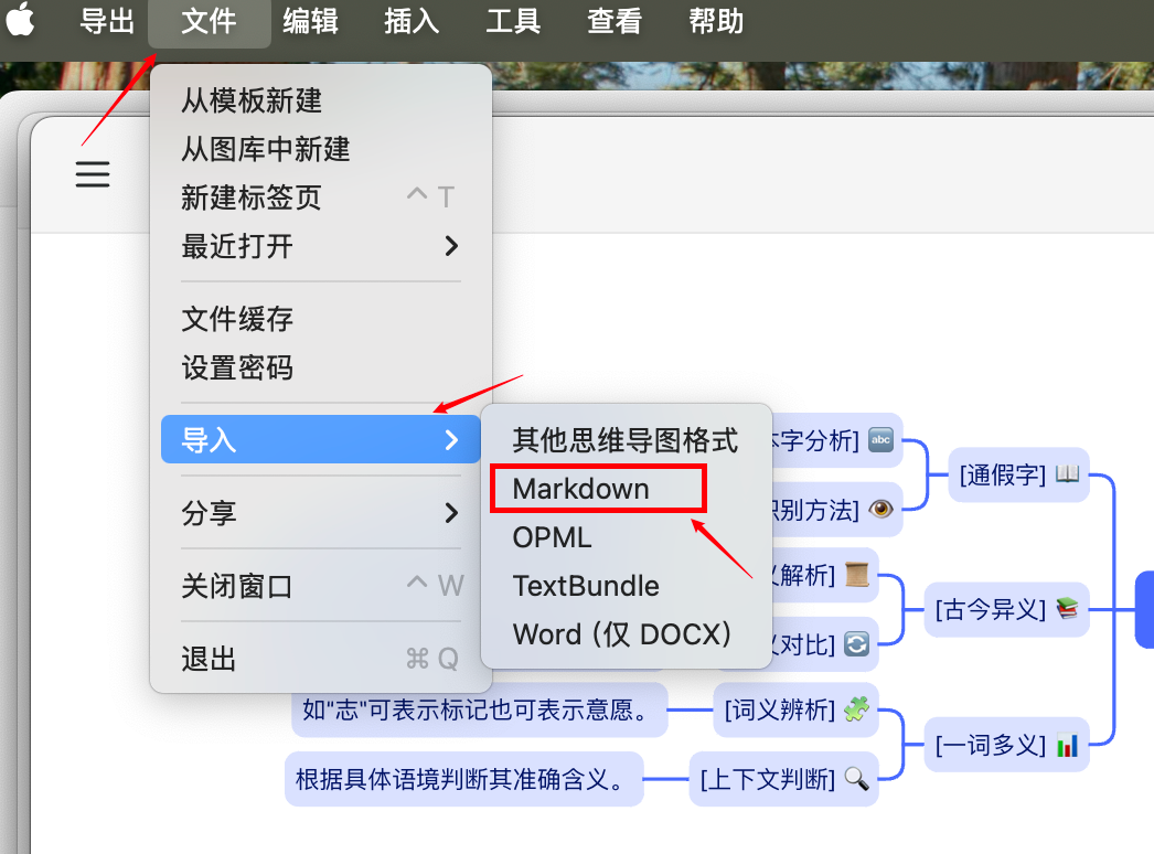 - 打开XMind软件,使用"导入" > "Markdown"功能导入该文件。