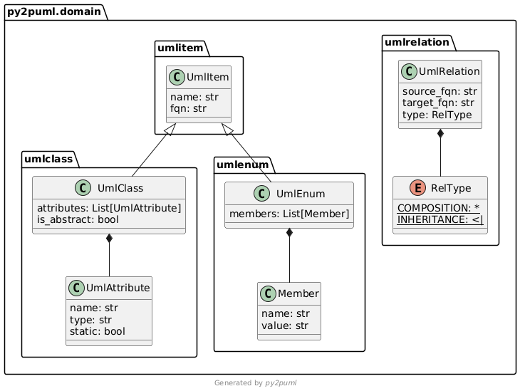 py2puml py2puml/domain py2puml.domainThis outputs the following PlantUML content: