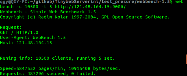注意: 使用本项目的webbench进行压测时,若报错显示webbench命令找不到,将可执行文件webbench删除后,重新编译即可。
