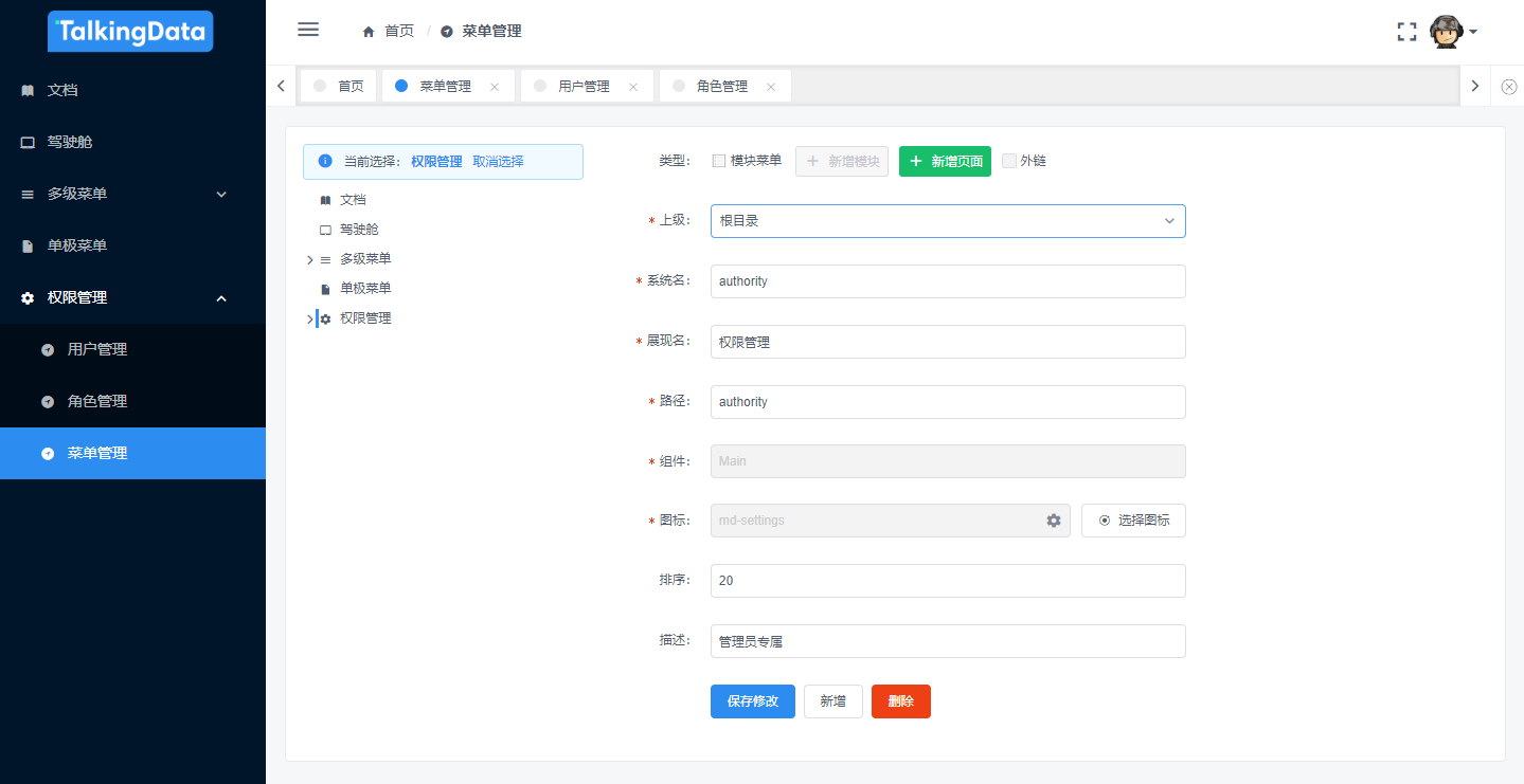 权限管理 - 菜单管理,可任意新增/更新菜单、修改层级、修改上级目录: