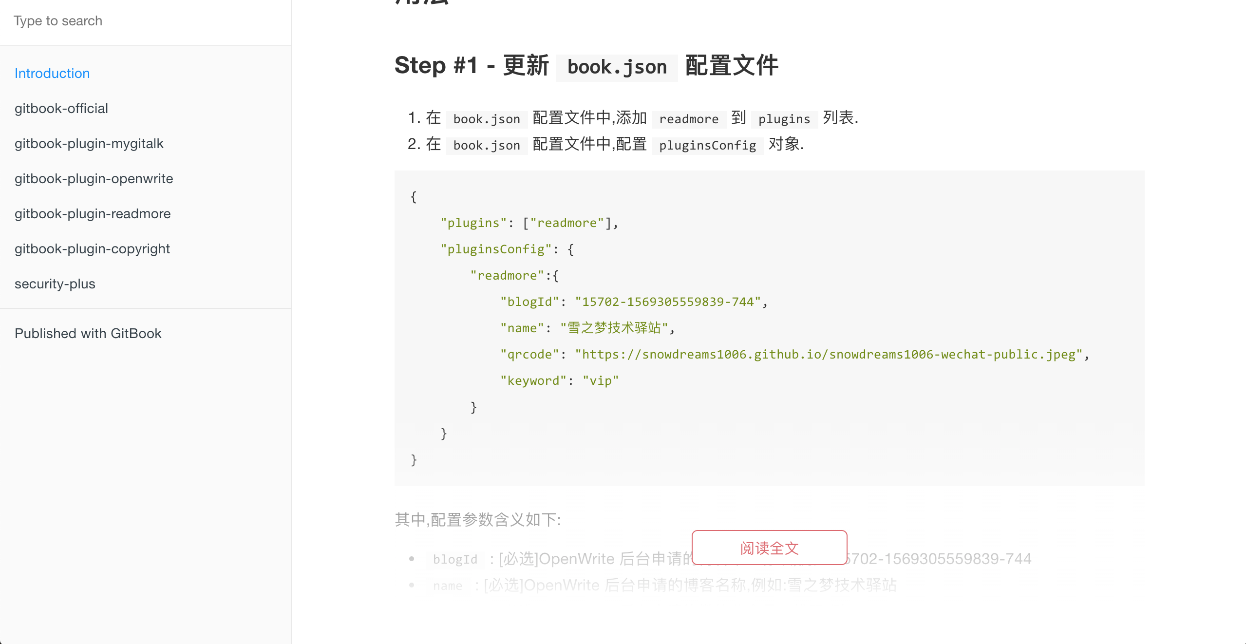 book.json配置文件中,添加readmore到plugins列表. - 在