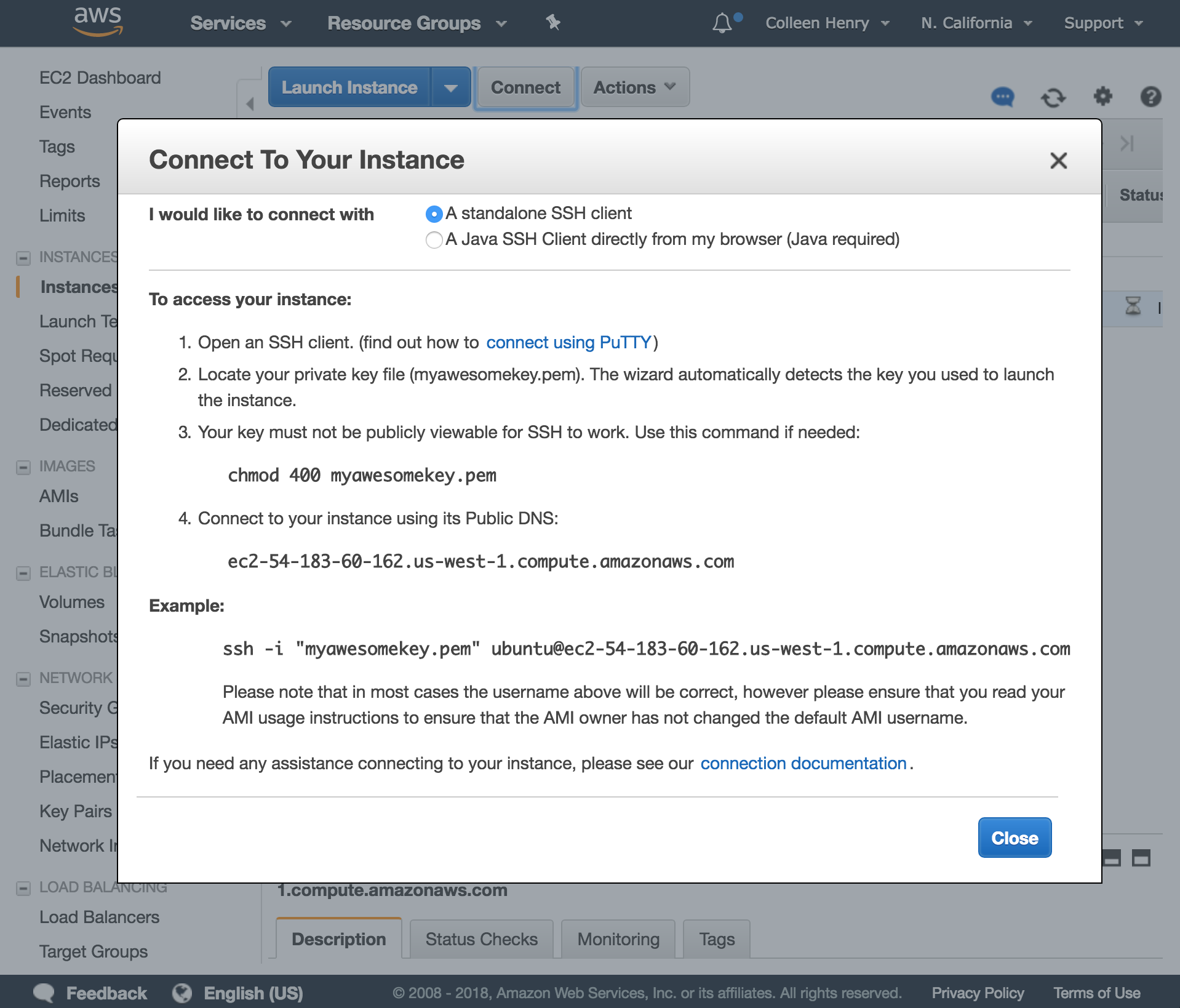 Now we will want to click on “Connect” up near the launch instance button. This will show you how to SSH (remotely connect to the command line shell of the remote server.) This step is different based on your personal operating system. There is a link to directions on this screen for how to connect via Windows if you hit “connect using PuTTY”.