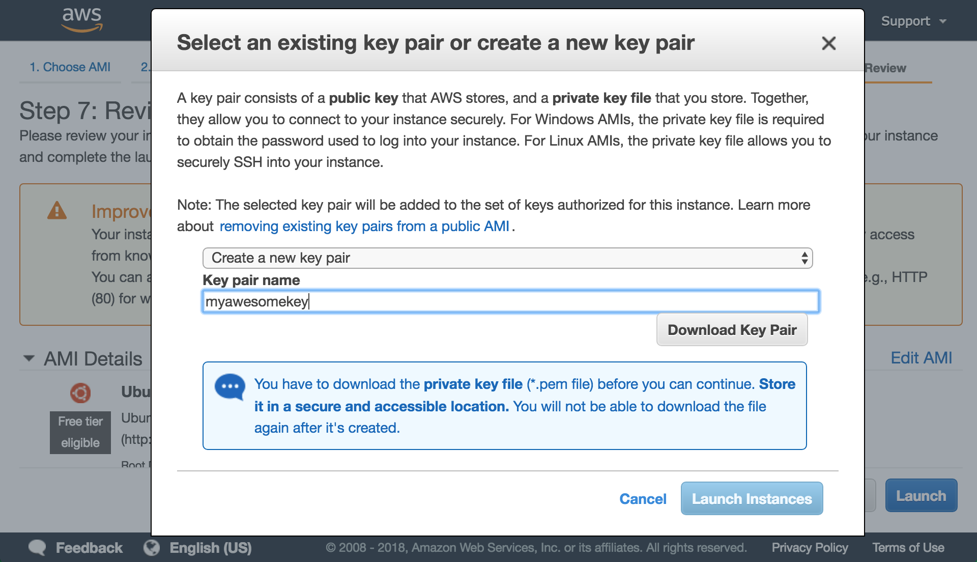 Next a dialogue will ask you to “Select an existing key pair or create a new key pair.” You will want to “Create a new key pair” and name it. I’ll call it “myawesomekey.” Hit "Download Key Pair" to download the key.