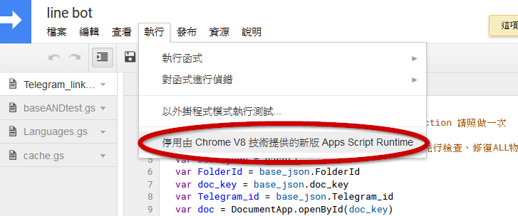 三個gs檔(google apps script),並將v3其中的"Telegram_link_Line.gs"的內容複製在一開始給你的"程式碼"區內。