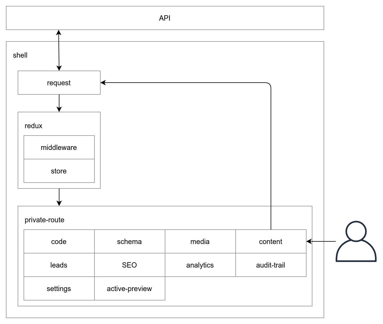 A redux store is used to manage state across all of the potential sub-apps. The shell setups a global store which is then shared to sub-apps that can dynamically inject reducers if needed.